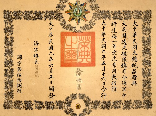 China, Republic, Bestowal Document for the Order of the Striped Tiger, First Class, inscribed (in Chinese) ´The Great President of the Great Republic of China hereby gifts to Admiral the Commander-in-Chief of the Far East Fleet of Great Britain, the Order of the Striped Tiger First Class, as a mark of friendship, given on the 16th May, in the 9th Year [1920] of the Great Republic of China´, mounted on card in two parts, some damage, with translation Estimate £ 50-80 China, Order of the Striped Tiger, First Class London Gazette 26.7.1921 Adml. Sir Alexander L. Duff, K.C.B. Admiral Sir Alexander Ludovic Duff, G.C.B. ,G.B.E., K.C.V.O., (1862-1933), born Banff, Scotland; Midshipman, October 1877; Advanced Rear-Admiral, 2.3.1913; served during the Great War with the 4th Battle Squadron, 1914-17, and present at the Battle of Jutland (C.B., Mentioned in Despatches); Assistant Chief of Naval Staff, 1918-19; Vice-Admiral, 15.1.1918; Appointed Commander-in-Chief, China Station, 24.7.1919; Admiral, 1.7.1921; retired, 1.7.1925.