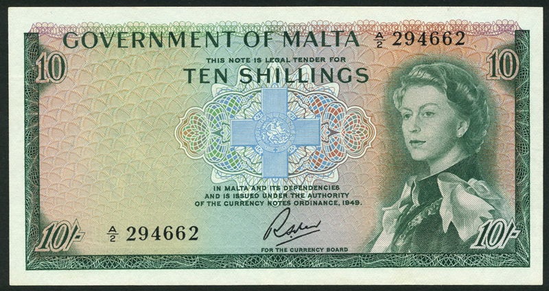 Government of Malta 10/-, green, and £1, brown-purple, ND (1963), Elizabeth II at right, George Cross at left, Soler signature