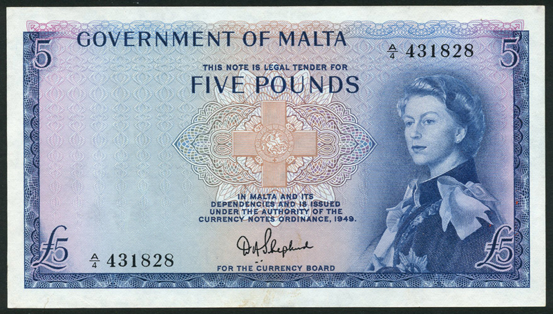 Government of Malta, £5, L1949 (1961), serial number A/431828, blue on multicolour underprint, Elizabeth II at right, Shepherd signature, reverse blue, Grand Harbor