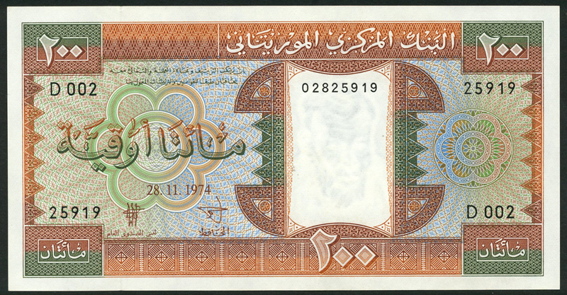 Banque Centrale de Mauretanie, 200 ouiguiya (5), 1974, serial numbers D 002-25919/20-25922/23/24, 1974, brown and multicoloured