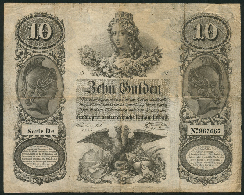 Privelegirte Oesterreische National-Bank, 10 gulden, 1 July 1847, serial number De 987667, black and white, allegorical helmeted female head at left and right, turreted female head top centre, twin eagles and arms low centre