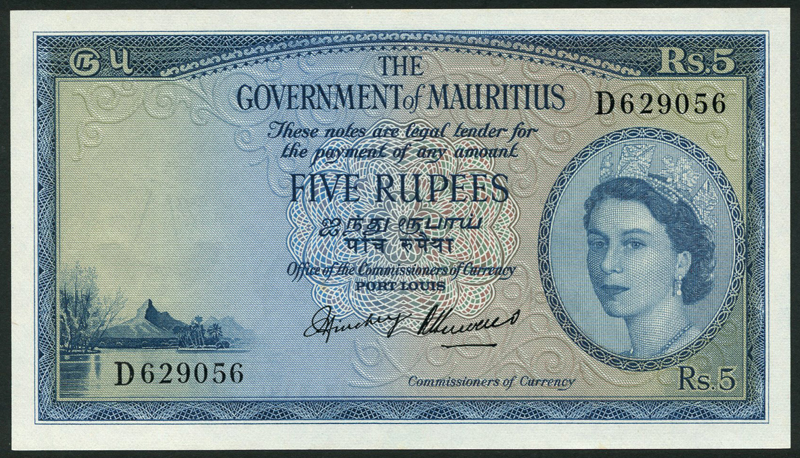 Government of Mauritius, 5 rupees, ND (1954), serial number D 629056, blue and multicoloured, Elizabeth II at right, reverse blue, arms at centre