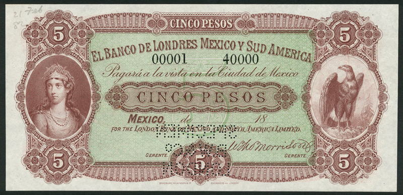 El Banco de Londres Mexico y Sud America, specimen 5 pesos, Mexico, 18- (ca 1882), serial number 00001-40000, purple-brown and green, maiden (Liberty) at left, eagle at right, value at centre and in border around, reverse pink, medallic female head at left and right, value in field