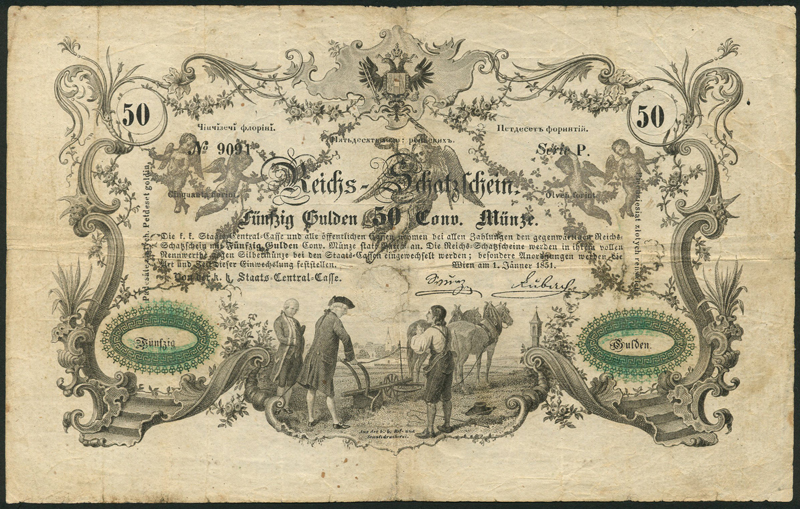 K.K.Staats-Central-Casse, 50 gulden, 1 January 1851, serial number P 9091, black and white, arms and angel top centre, the Emperor Joseph II, aide and a farmer with plough team low centre, green tint low left and right