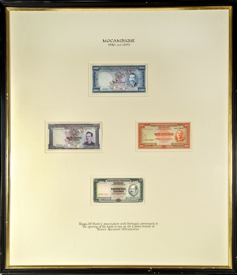 Banco Nacional Ultramarino, Mozambique, framed specimen set of the 1950-53 issue, comprising 50 escudos, black, E. Costa at right, 100 escudos, orange, A. de Ornelas at right, 500 escudos, brown-violet, C. Xavier at right and 1000 escudos, blue, Albuquerque at right