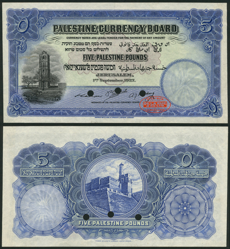 Palestine Currency Board, colour trial 5 pounds, 1 September 1927, blue, pale green and mauve, the White tower at Ramleh at left, value at centre and at each corner, Couper, Ezechiel and Harding signatures, reverse the Tower of David and the citadel of Jerusalem at centre, value top left and right