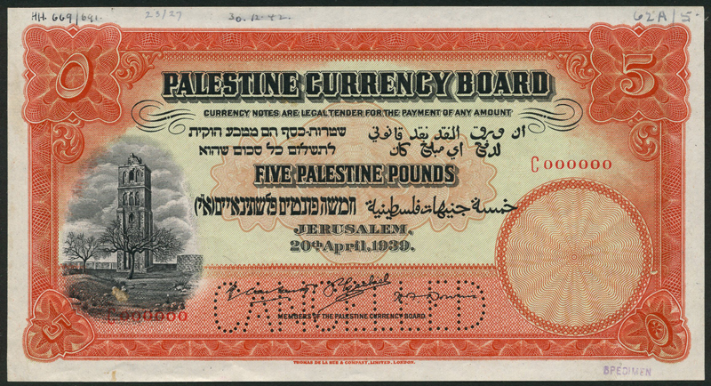 Palestine Currency Board, specimen £5, 20 April 1939, red serial number C 000000, red and pale green, value in pale brown guilloche at centre, the White Tower at Ramleh at left, signatures of Caulcutt, Ezechiel and Downie low centre, reverse red, the Citadel of Jerusalem and the Tower of David at centre, value at left and right