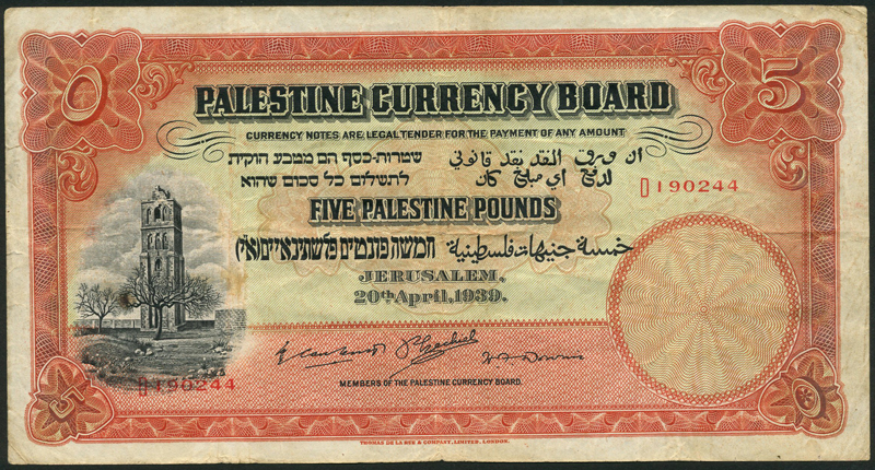 Palestine Currency Board, £5, 20 April 1939, red serial number D190244, red-orange and pale green, the White tower, Ramleh, at left, value in pale lilac guilloche at centre, value at each corner, three printed signatures of the Members of the Palestine Currency Board at centre, Sir John Caulcutt, Sir Percy Ezechiel and Roland Venables Vernon, reverse red-orange, the Citadel of Jerusalem with Tower of David at centre, value at left and right and low centre