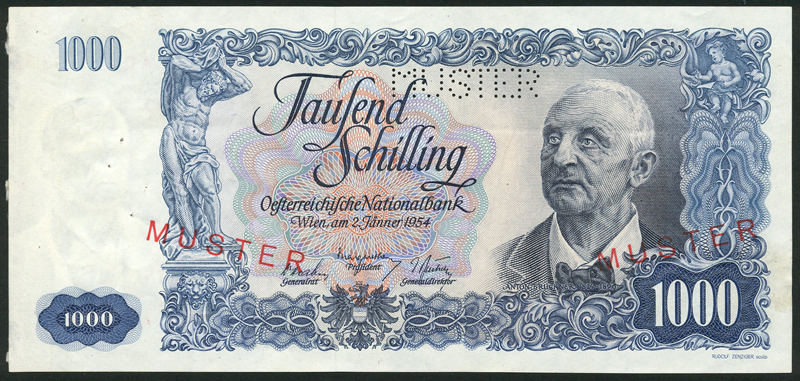 Austrian National Bank, specimen 10 schilling (2), 1950, purple, also specimen 1000 schilling, 2 January 1954, blue and multicoloured, A. Bruckner at right