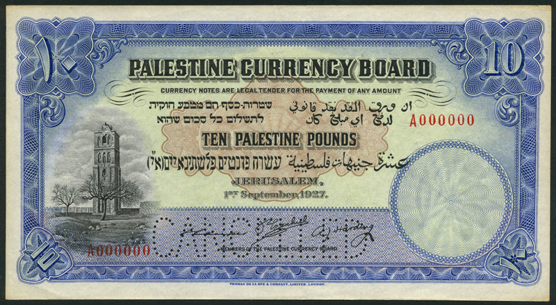 Palestine Currency Board, specimen £10, 1 September 1927, red zero serial numbers, blue and pale green, The White Tower at Ramleh at left, value at each corner, reverse green, the Citadel of Jerusalem at centre, value at left and right and low centre