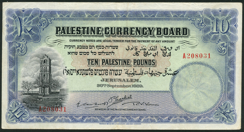 Palestine Currency Board, £10, 30 September 1929, serial number A208031, blue and pale green, the White Tower, Ramleh, at left, value in pale brown guilloche at centre, value at each corner