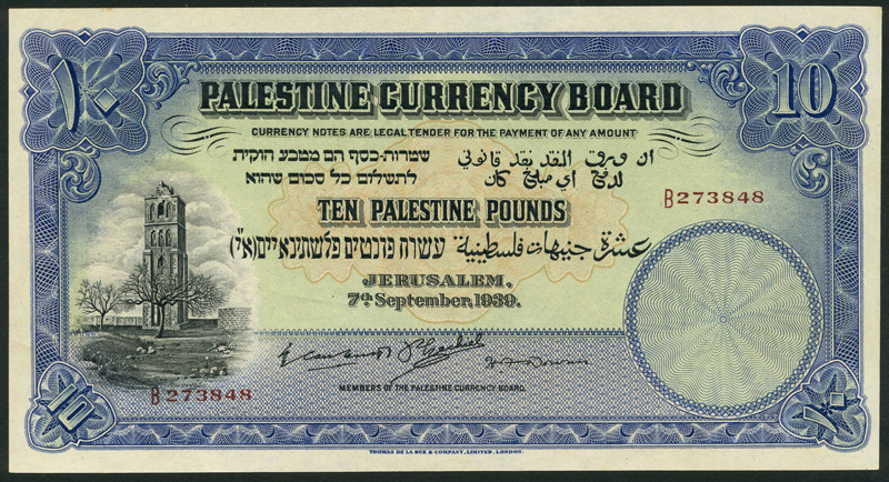 Palestine Currency Board, £10, 7 September 1939, red serial number B273848, blue and pale green, the White Tower, Ramleh, at left, value in pale brown guilloche at centre, value at each corner, three printed signatures of the Members of the Palestine Currency Board at centre, Sir John Caulcutt, Sir Percy Ezehiel and H.F.Downie, reverse blue, the Citadel of Jerusalem with the Tower of David at centre, value at left and right and low centre