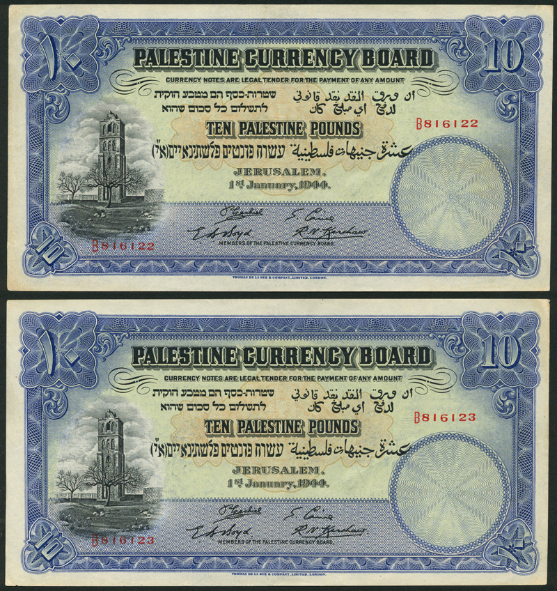 Palestine Currency Board, £10 (2), 1 January 1944, red consecutive serial numbers B846122-23, blue and pale green, the White Tower, Ramleh, at left, value in pale brown guilloche at centre, value at each corner, reverse blue, the Citadel of Jerusalem with the Tower of David at centre, value at left and right and low centre