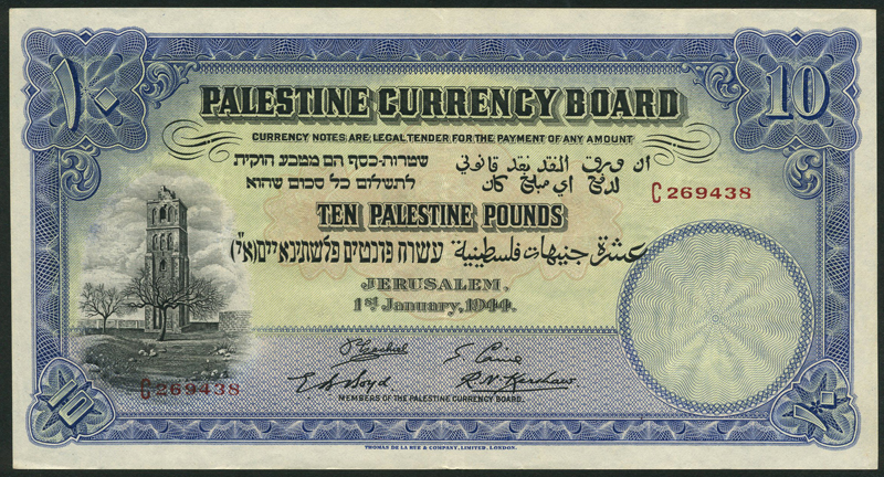 Palestine Currency Board, £10, 1 January 1944, red serial number C269438, blue and pale green, the White Tower, Ramleh, at left, value in pale brown guilloche at centre, value at each corner, three printed signatures of the Members of the Palestine Currency Board , E.B.Boyd, Sir Percy Ezechiel and R.N.Kershaw low centre, reverse blue, the Citadel of Jerusalem with the Tower of David at centre, value at left and right and low centre