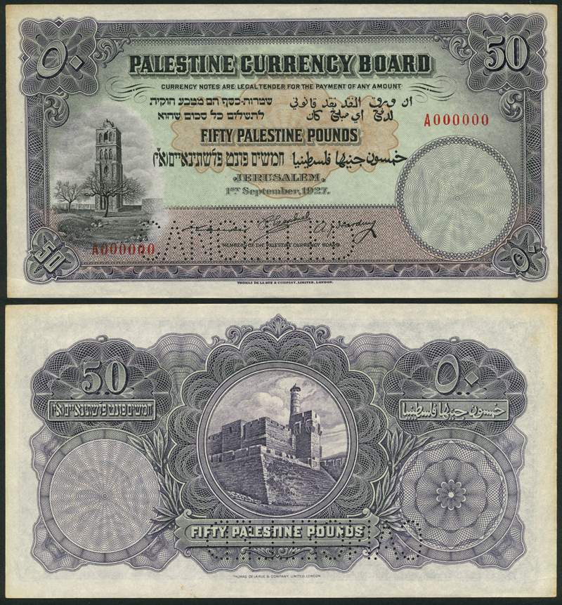 Palestine Currency Board, specimen £50, 1 September 1927, red serial number A000000, purple and pale green, the White Tower at Ramleh at left, value at centre in pale brown guilloche, value at each corner, three printed signatures low centre of Leslie Couper, Sir Percy Ezchiel and A.J.Harding, the members of the Palestine Currency Board, reverse purple and green, the Citadel of Jerusalem with the Tower of David at centre, value at left and right and low centre