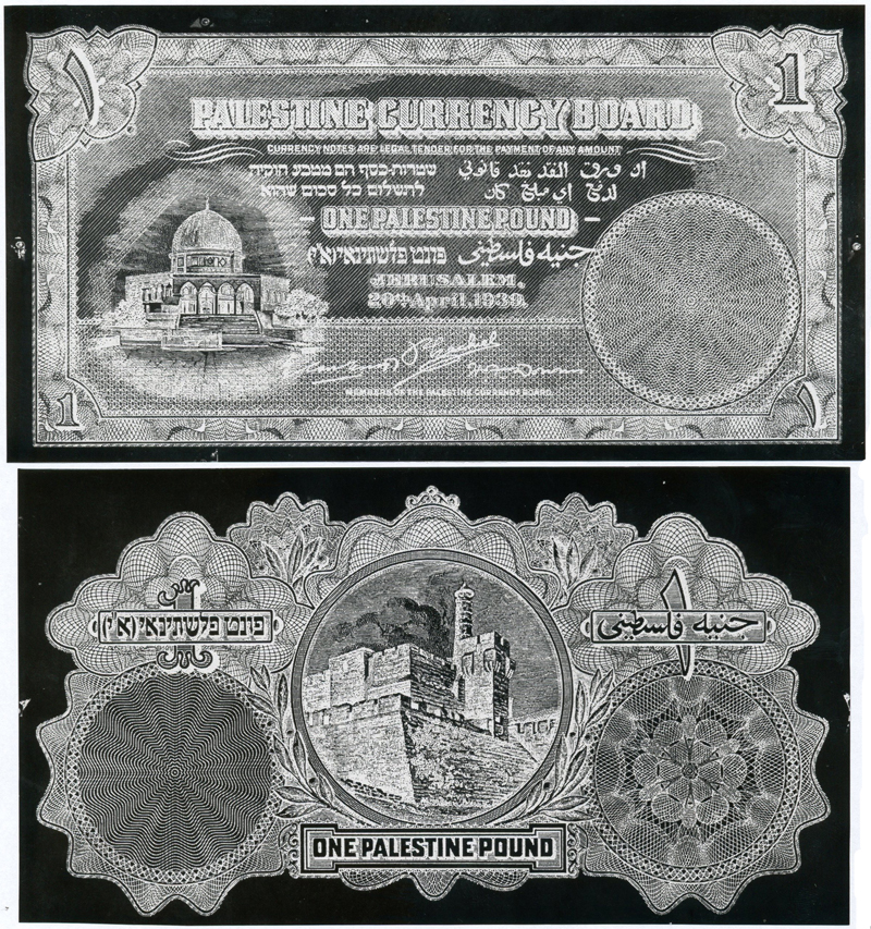 Palestine Currency Board, £1, obverse and reverse negative prints on transparent acetate, 20 April 1939, no serial number, The Dome on the Rock, Jerusalem at left, value in lilac guilloche at centre, value at each corner, three printed signatures of the Members of the Palestine Currency Board, Sir John Caulcutt, Sir Percy Ezchiel and H.F. Downie at low centre, reverse, the Citadel of Jerusalem with the Tower of David at centre, value at left and right and low centre