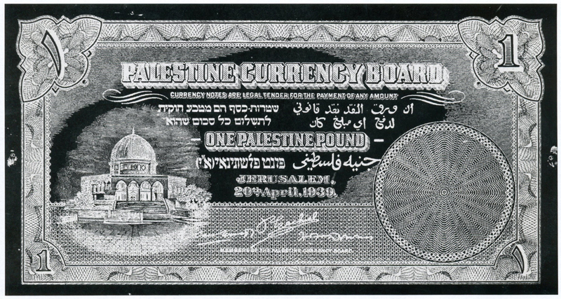 Palestine Currency Board, £1, obverse negative print on transparent acetate, 20 April 1939, no serial number, The Dome on the Rock, Jerusalem at left, value in lilac guilloche at centre, value at each corner, three printed signatures of the Members of the Palestine Currency Board, Sir John Caulcutt, Sir Percy Ezchiel and H.F. Downie at low centre