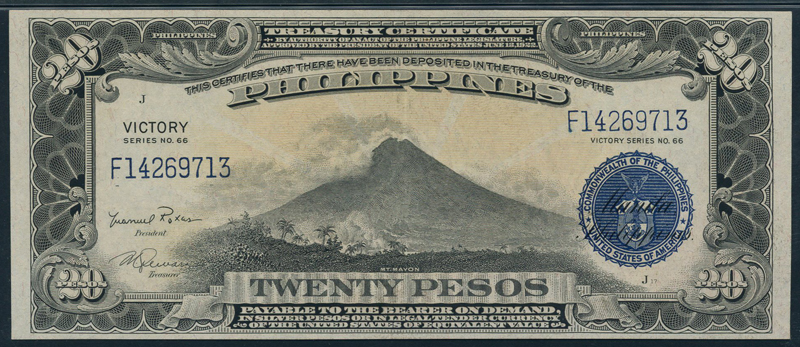 Philippines, Victory Series, 20 pesos, ND (1944), serial number F14269713, black on yellow underprint, Mount Mayon at centre, blue seal at right, value at each corner, reverse tan, arms at centre, overprinted VICTORY in black, signatures Roxas and Guevara, also Philippines National Bank, 2 pesos, 1921, red serial number B987587B, black on red underprint, Rizal at top left, value at low centre and each corner, reverse blue, value at centre and each corner
