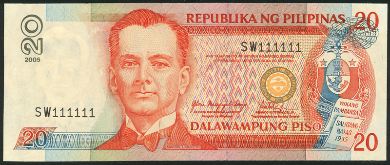 Central Bank of Philippines, 20 piso (5), serial numbers HB 777777 (2005), SL 444444 (2000),SL 555555 (2000),FU 444444 (2000),SW 111111 (2005) red-orange and multicoloured, Quezon at left, also 50 piso (3), 1999, 2006, serial numbers RP 555555, UA 654321, UJ 123456, purple, Osmena at left centre, 100 piso (9), 1999, serial numbers GD 555555, two examples dated 2004 with serial numbers ES 444444, UP 444444 QW 111111,RU 111111, RV 111111, KZ 444444, TC 555555, WG 444444, violet and multicoloured, Roxas left centre, flag at right also two examples dated 2002 and 2004 with serial numbers ES 444444, UP 444444