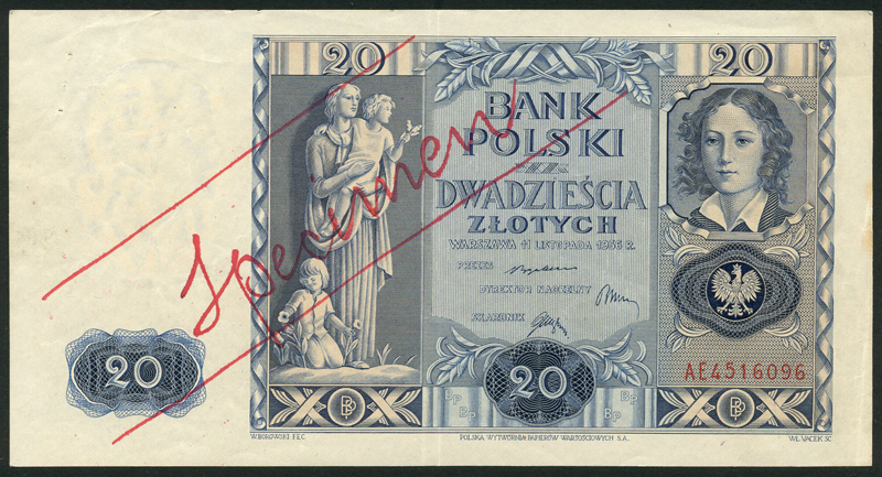 Bank Polski, specimen 20 zlotych, 11 November 1936, red serial number AE 4516069, blue, maiden and children at left, girl top right, also an obverse and reverse die proof 100 zlotych, 15 August 1939, black and white, man at right