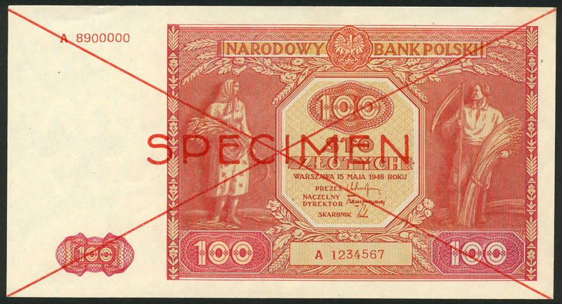 Narodowy Bank Polski, specimen 1 zloty, lilac, 2 zlote, green, 5 zlotych, blue-grey, 10 zlotych, brown, 1946, 20 zlotych, green and pink, 50 zlotych, 1946, brown, pale yellow and lilac, ship at left and right, 100 zlotych, 1946, red and pale beige, agricultural couple