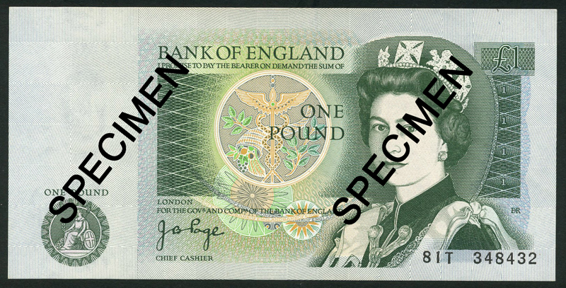 Bank of England, (J.B.Page), £1 , ND (1978), serial numbers 81T 348432, green and orange, Elizabeth II at right, caduceus top centre, Britannia low left, reverse Sir Isaac Newton right centre