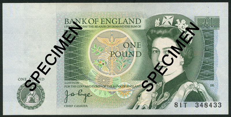 Bank of England, (J.B.Page), £1 , ND (1978), serial numbers 81T 348433, green and orange, Elizabeth II at right, caduceus top centre, Britannia low left, reverse Sir Isaac Newton right centre