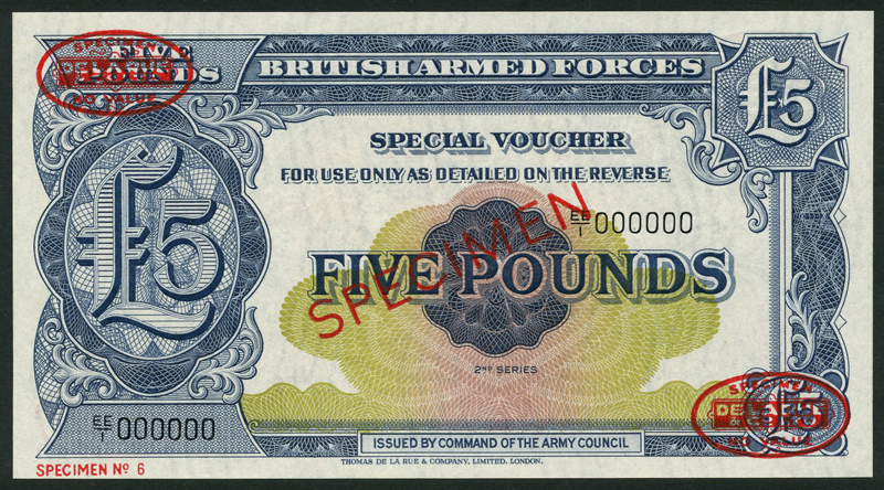 British Armed Forces, a specimen set of the second issue, ND (1948), comprising 3D, 6D, 1/-, 2/6, 5/-, 10/-, £5