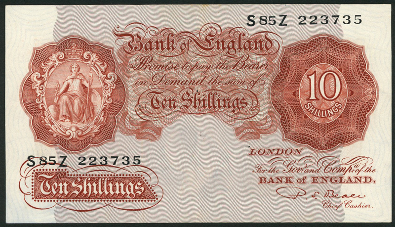 Bank of England, a group of 10/- notes (21), comprising Beale (2), consecutive pair of S85Z prefix, O´Brien, early type (3), prefixes E80Y, J77Y, A39Y, later type (2), prefixes B65 and H55, Hollom (3), prefixes 60E and L62, and Fforde (11), prefixes M80, C01N, C03N, and ten consecutive C26N, all red, Britannia or Elizabeth II,