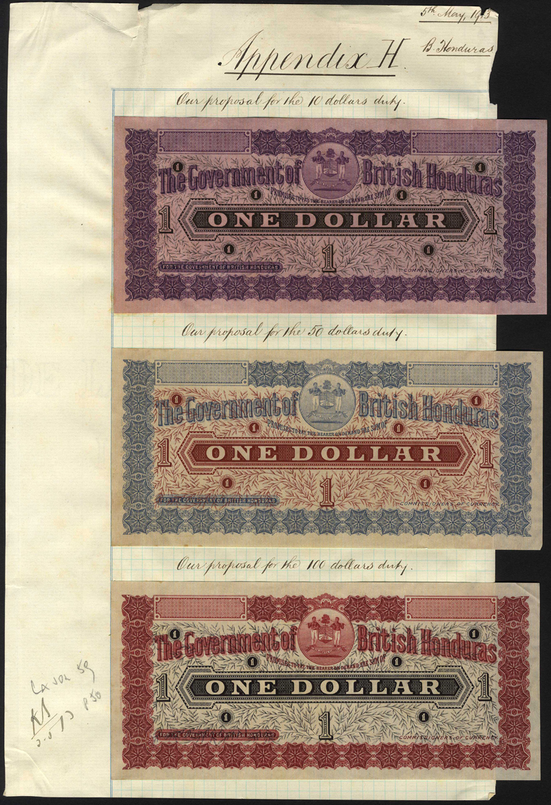 Government of British Honduras, uniface proof $1 (3), showing proposed colours for the 1924 issues of the $10, $50 and $100, mauve and black, blue-grey and brown and maroon and black respectively, all with arms at top centre, value in tablet at centre, and at low centre, left and right, mounted on paper with the title "Appendix H" and dated "5th May 1913"