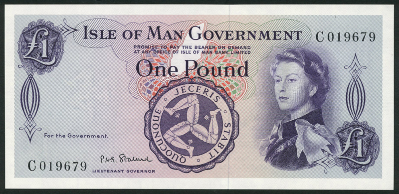 Isle of Man Government, 10/-, ND (1961 issue), serial number A494512, red on multicolour, 50 new pence, ND (1969 issue), serial number 177342, turquoise on multicolour, £1, ND (1961 issue), serial number C019679, purple on multicolour, all with Stallard signature, all with Elizabeth II at right, arms at low centre, map of the island above, value at top left and low right