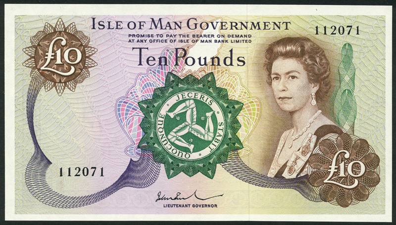 Isle of Man Government, £10, ND (1961-), serial number 112071, brown, green and violet, Elizabeth II at right, triskeles at centre, Paul signature