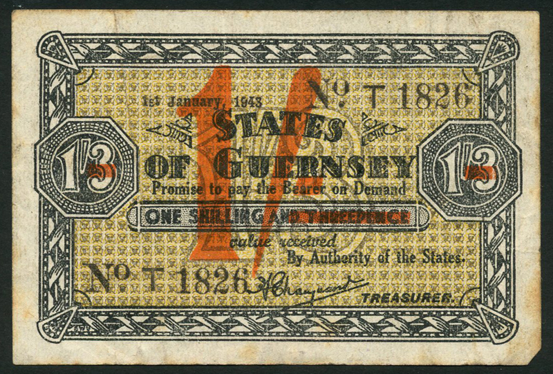 States of Guernsey, 1/3D, 16 october 1941, serial number O 3933,, black and brown on white, value in underprint at centre and at left and right, Marquand signature, also a 1/3D, as previous but red -orange 1/- at centre
