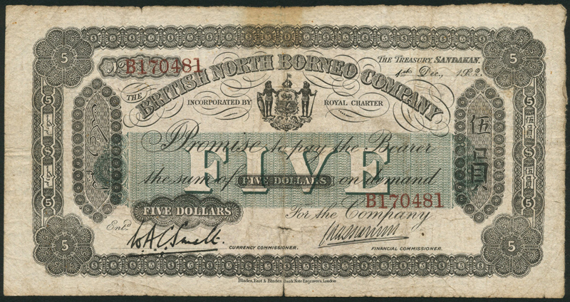 British North Borneo Company, $5, 1 December 1922, serial number B170481, black on green underprint, arms at top centre, value at centre and each corner, reverse red, values