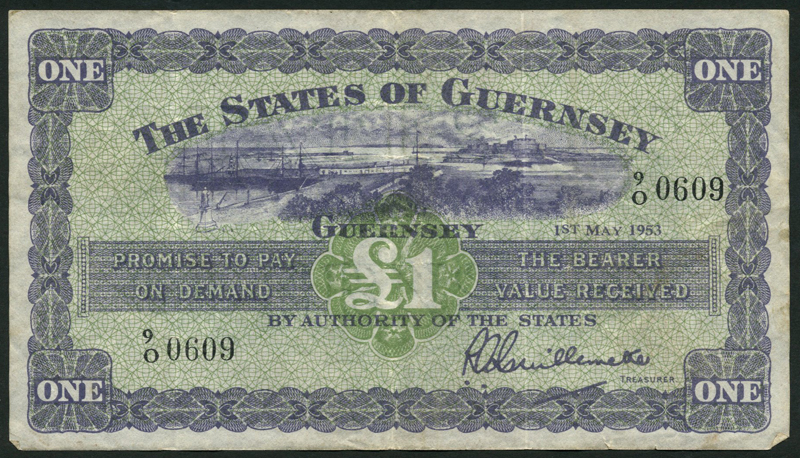 States of Guernsey, £1 (4), 1953, 1954, 1962 (3), violet and green, view of Saint Peter Port top centre, value in green at centre, Guillemette signature low right, value at each corner, reverse green guilloche at centre, arms at centre