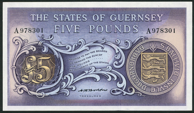States of Guernsey, £5, ND (1969-), serial number A978301 violet, value in orange at left, arms in orange at right, Hodder signature and £5, serial number B359321