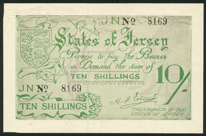 States of Jersey, 10/-, ND (1941-), serial number 8169, green, arms at left