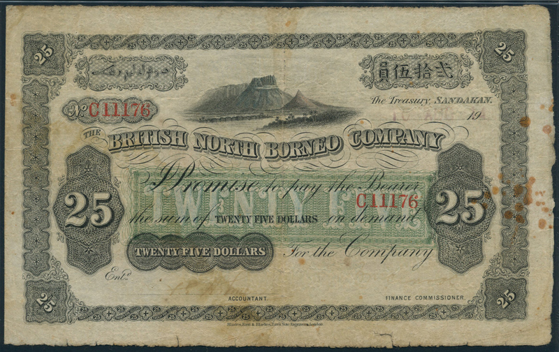 British North Borneo Company, $25, 19- (1922-27), serial number C11176, black on green underprint, mountain scene at top centre, value in underprint, at left and right and each corner, reverse grey-brown, value at centre