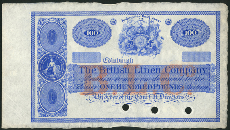 British Linen Company, specimen £100, Edinburgh, ND (18-), blue and white, bank initials in red underprint at centre, arms at top centre, Britannia in circular frame at left centre