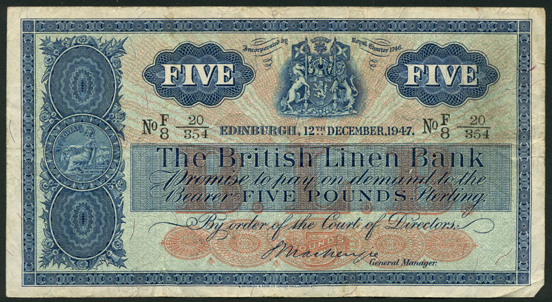 British Linen Bank, £5 (4), 1947, 1956 (2) and 1959, also £20, 1953, all blue on multicolour underprint, arms at top right centre, flanked by values, Britannia at centre left, reverse blue, Britannia at centre