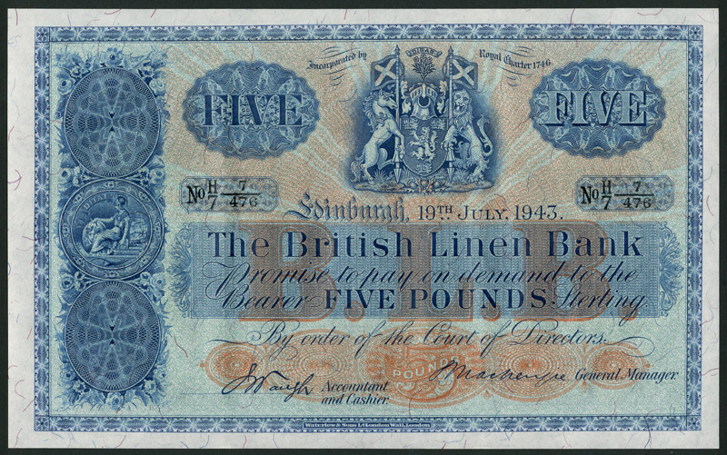 British Linen Bank, £5 (2), 19 July 1943, serial numbers H/7 7/475 and 476, blue, red sunburst design at centre, arms top centre, value top left and right, Britannia left centre, printed signatures of Waugh and Mackenzie, reverse blue, Britannia at centre, value at left and right