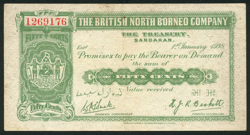 British North Borneo Company, 50 cents, 1 January 1938, red serial number 1269176, green on cream paper, arms at left, reverse value at centre