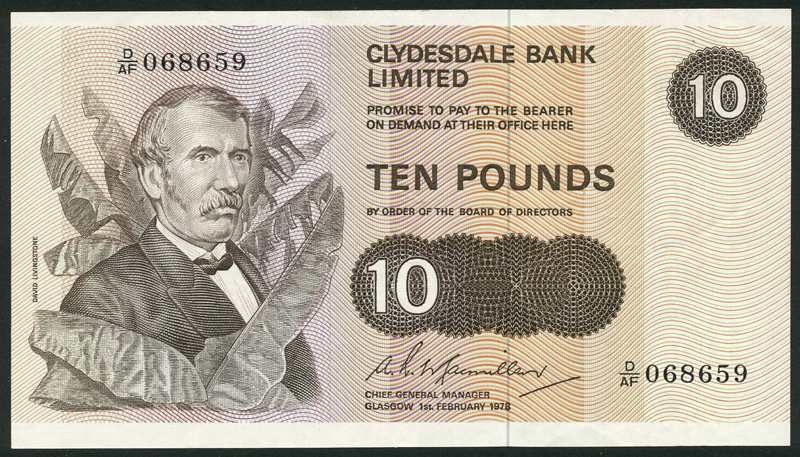 Clydesdale Bank Limited, £10, 1 February 1978, serial number D/AF 068659, dark brown on multicolour underprint, Livingstone at left, also £1, 1969, prefix C/R and Clydesdale and North of Scotland Bank Limited, £1, 1963,prefix B/G, both dark green on multicolour, arms at right