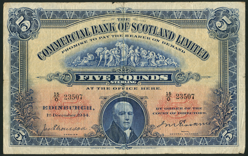 Commercial Bank of Scotland Limited, £5 (2), 1944, prefix 15/O, blue, yellow and red, classical frieze top centre, John Pitcairn low centre, Thomson and Erskine signatures