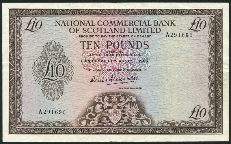 National Commercial Bank of Scotland Limited, £10, 1966, prefix A/1, brown, arms low centre, Alexander signature, also Royal Bank of Scotland Limited, £10, 1969, prefix A/1, brown, arms low centre, Burke signature
