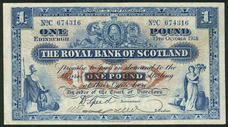 Royal Bank of Scotland, a sizable group of notes comprising £1 (11), 1928, 1939, 1947, 1952, 1954, 1955, 1965, 1966, 1967, 1969 and 1970, £5 (5), 1966, 1969, 1970 (2), 1976 and 1985, £10, 1969, and £20 (3), 1969, 1981 and 1982,