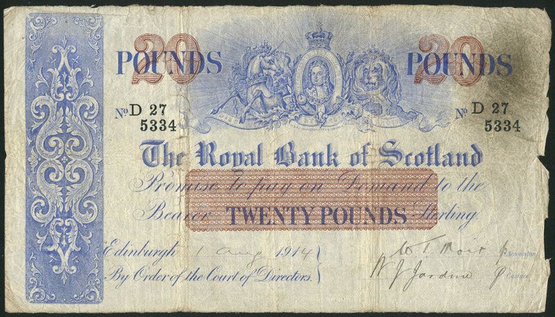 Royal Bank of Scotland, £20, 1 August 1914, prefix D, blue and white with value and brown tablet at centre, manuscript signatures low right, also £5, 2 February 1929, as previous, printed signature of Speed low right