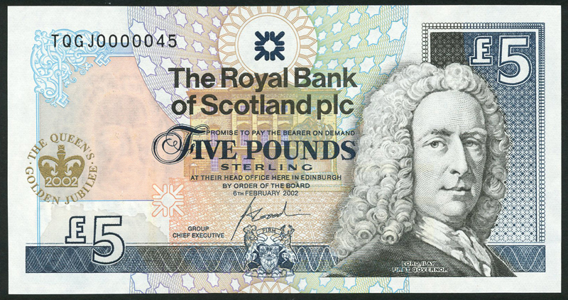 Royal Bank of Scotland plc., £5 (5), 2002, serial numbers TQG J0000045/46/47/48 and 2897, blue and multicoloured, Lord Ilay at right, the Queen´s Golden Jubilee commemorative issue