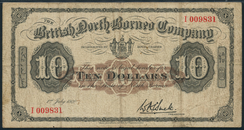 British North Borneo Company, $10, 1 July 1940, serial number I009831, black on brown underprint, arms at top centre, value at left and right and each corner, reverse blue, value