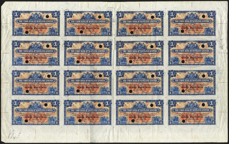 Union Bank of Scotland Limited, a sheet of sixteen unissued uniface £1 (16), 5 December 1931, series F, blue, red and orange, arms top centre, equestrian statue low left and right, signatures of Hird and Mcrindle